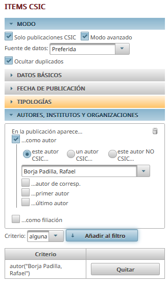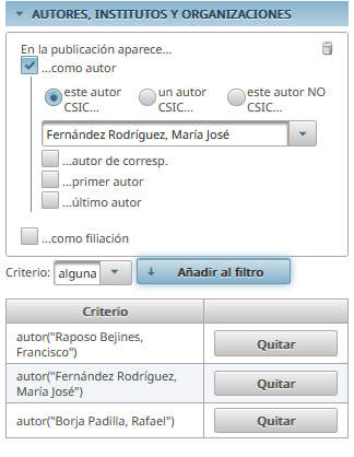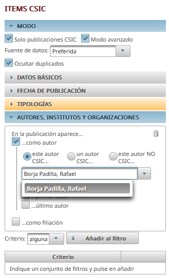 Ahora, desmarcamos la opción "...como autor" y marcamos "...como filiación". Por defecto estará seleccionada "esta entidad CSIC". En su campo, escribo el nombre del instituto y lo selecciono entre los resultados. En el desplegable "Criterio", cambio al criterio "y" y pincho en añadir al filtro: